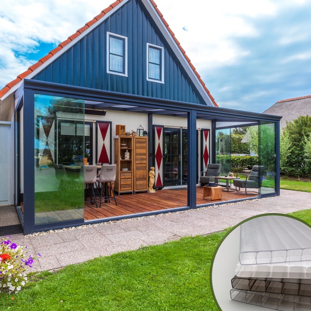 Die Giallo Überdachung ist die ideale Wahl für diejenigen, die eine robustere und gradlinigere Lösung bevorzugen. Diese Variante zeichnet sich durch ihre hohe Stabilität und modernes Design aus. Wie bei der Bosco Terrassenüberdachung stehen Ihnen auch hier Stegplatten und VSG-Glas als Dacheindeckung zur Verfügung. Dank ihrer Robustheit kann die Giallo Überdachung eine Spannweite von bis zu 6 Metern mit Stegplatten und 4 Metern mit Glas auf nur 2 Pfosten erreichen, was Ihnen stets eine freie Sicht in Ihren Garten ermöglicht. Die Giallo Terrassenüberdachung überzeugt durch ihre klare Linienführung und die Möglichkeit, verschiedene Konfigurationsmöglichkeiten wie Farbe und Maße zu wählen.